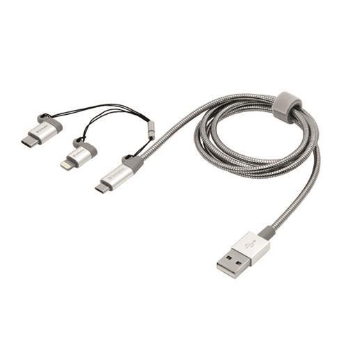 Charge multiple devices with this single cable- the Verbatim 3-in-1 Sync and Charge cable is the ideal companion for anyone who owns devices with different charging ports. Boasting interchangeable connector heads ensuring compatibility with all USB-C, Lightning and Micro-B USB smartphones and tablets; this 1m cable features an exceptionally durable stainless-steel design, without compromising on flexibility.